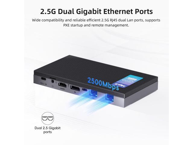 - Ultra-Slim with 2.5G Dual LANWith an exceptionally compact 0.34L form factor, this slim PC is both powerful and space-efficient. Despite its small size, it's equipped with dual 2.5G Ethernet ports, a fully functional USB-C, HDMI, and more, making it a very versatile Mini PC on the market. It's perfect for users who prioritize both space efficiency and robust functionality