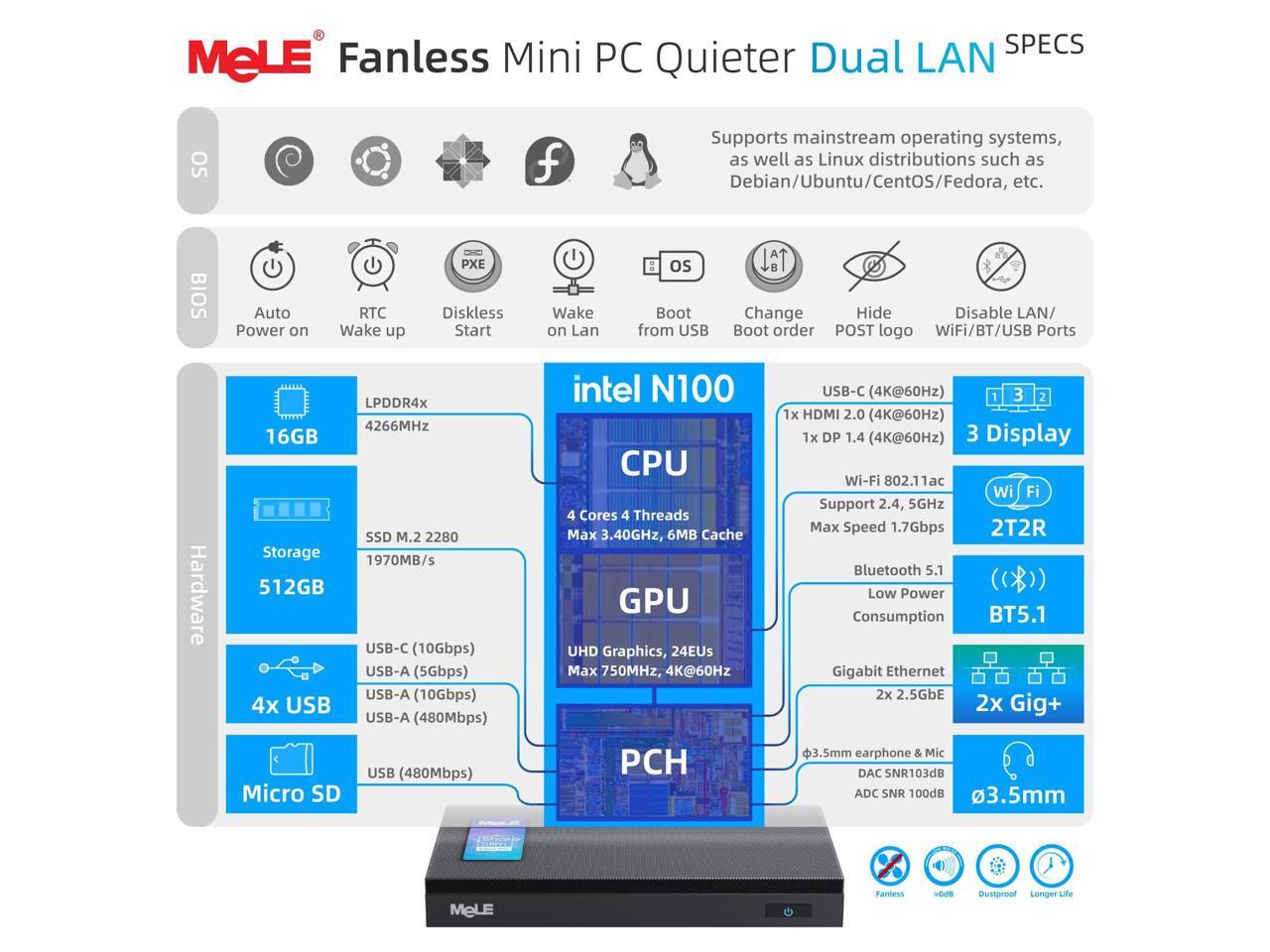 MeLE QuieterDL Mini PC, Dual LAN 2.5G, N100 Fanless Mini Computers, 16GB 4266MHz LPDDR4x, 512GB SSD, Full-Function USB-C,4K Triple Display Desktop PC on Office, Education, Industrial,Astrophotography