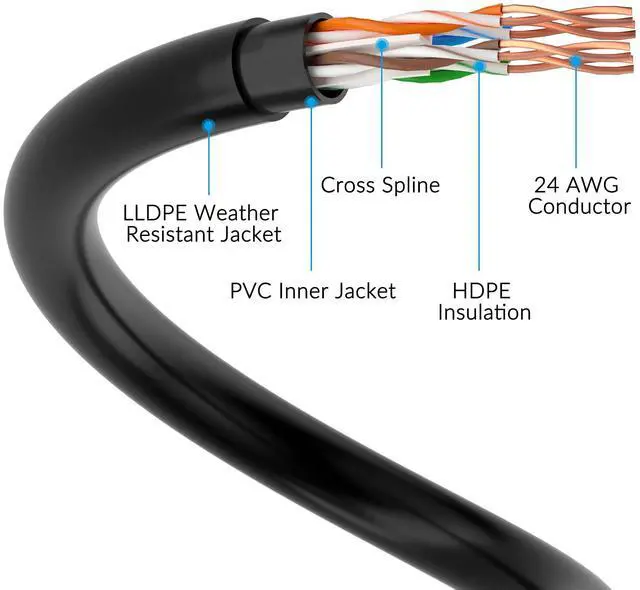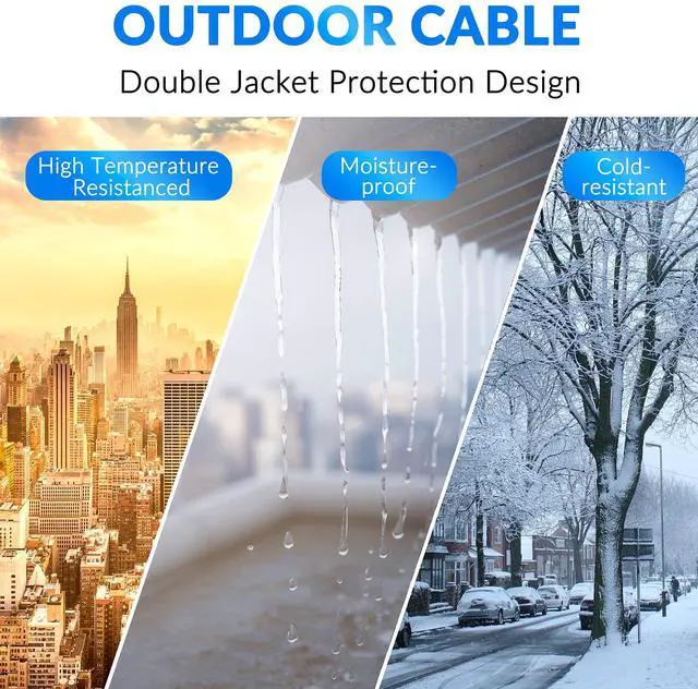 • Rugged Outdoor Ethernet Cable: Cat6 heavy-duty cable features UV Resistant LLDPE weather jacket and PVC inner jacket to provide double-layer protection to achieve the effects of high temperature resistance, moisture proof, cold resistance and other extreme weather. At the same time, avoid animals damaging it. So much so that the Cat6 network cable has a long service life and is suitable for in-wall, in-ground, underground, garage and direct burial installations.