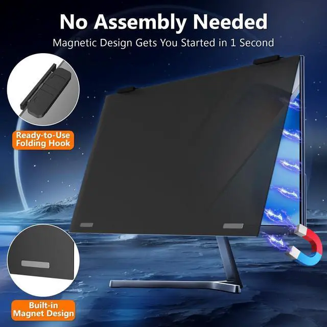 Note: dimensions exclude the bezel and Not suitable for curved monitor ^^ 4th Generation Magnetic DesignThe 4th Generation Magnetic Design offers cutting-edge screen protector technology for seamless, secure attachment to devices. The computer privacy screen 22 inch provides easy installation and removal while ensuring stability. Users enjoy a clutter-free workspace and the convenience of quickly swapping screens as needed ^^ 6A Enhanced MaterialsOur magnetic hanging 22 inch privacy screen filter integrates six specialized layers into one design. It enhances privacy, filters harmful light, resists dust, minimizes motion blur, and ensures a bubble-free application. These features improve visual clarity and user comfort for a superior viewing experience ^^ 29-Degree Extreme Privacy Viewing AngleWith a 29-degree privacy angle, the magnetic computer screen privacy shield appears darkened from side angles, protecting sensitive information. This is ideal for public spaces where privacy matters, such as offices or cafes ^^ HD Eye ProtectionDesigned for HD eye protection, our privacy screen filter for computer monitor 22 inch delivers clear visuals while safeguarding eyes from prolonged screen exposure. Protective layers against blue and UV light ensure a comfortable and healthier computing experience, suitable for daily and professional use
