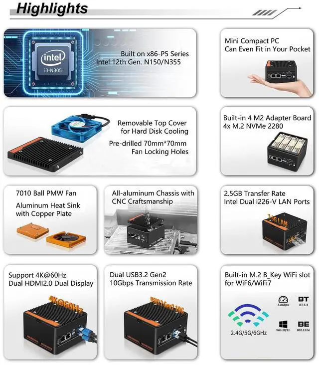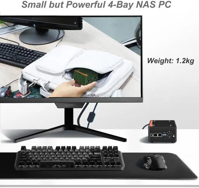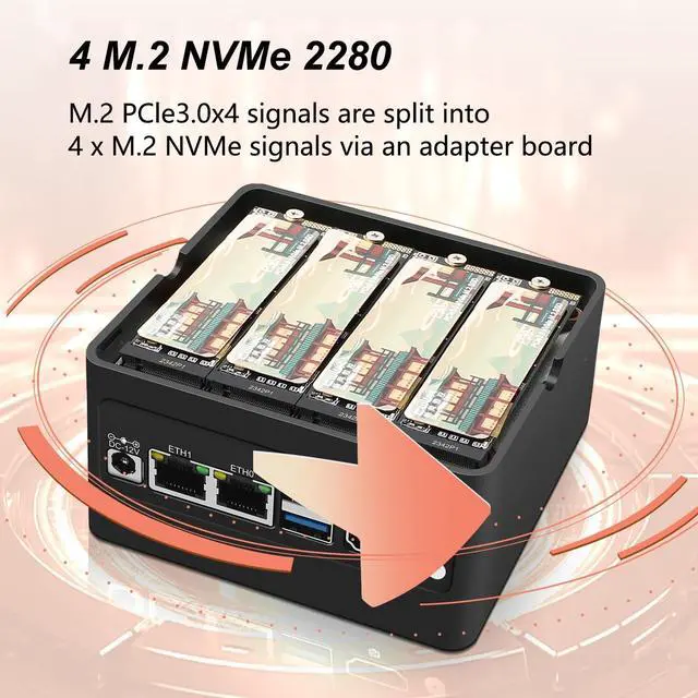 Large Capacity: This compact pc comes with NO RAM NO SSD. It has 1 x DDR5 slot (It supports MAX RAM 48GB), 4 x M. 2 NVMe 2280 PCIe 3.0 x1 signal for 4-Bay NAS Applications. It's compatible with Crucial RAM and top brand memory ^^ 2 x 2.5G bE