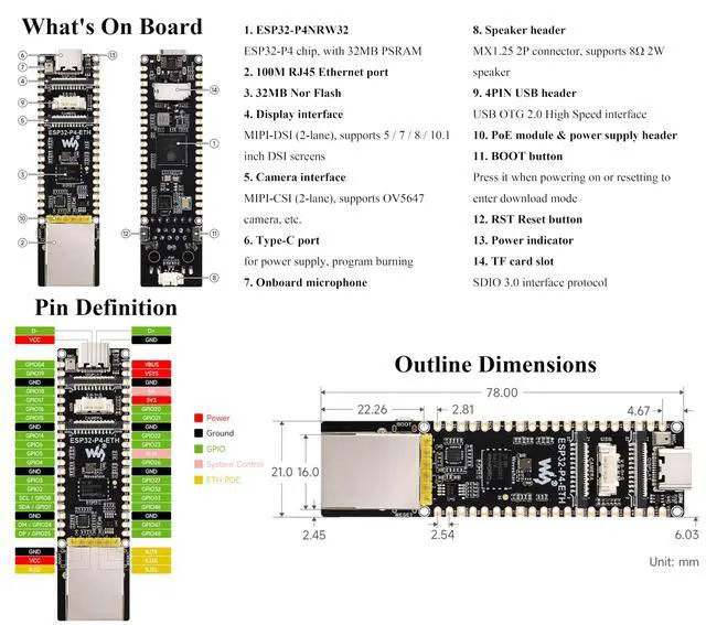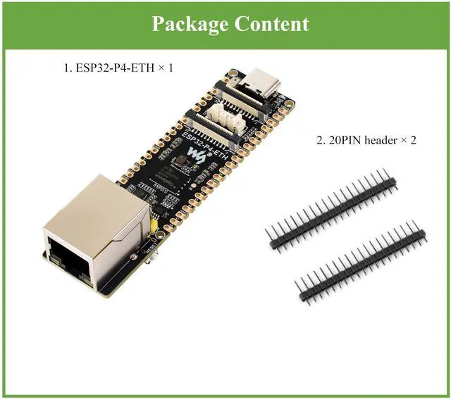 ESP32-P4-ETH Development Board, Based On ESP32-P4. Rich Human-machine Interfaces. High-performance MCU equipped with RISC-V 32-bit dual-core and single-core processors. Equipped with RISC-V 32-bit single-core processor (LP system).