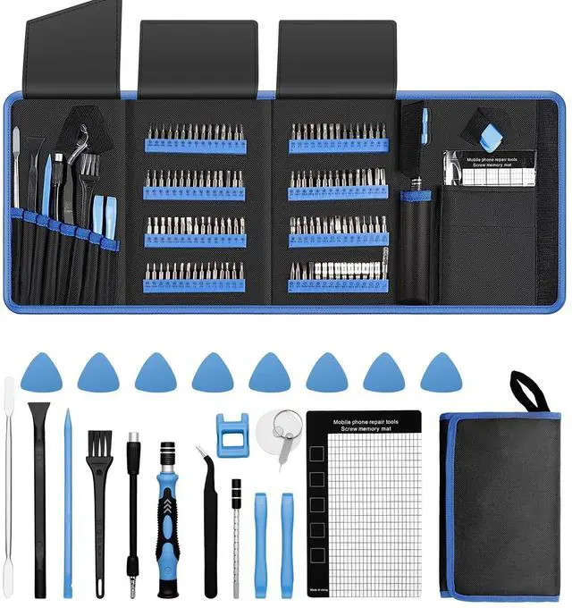 Precision Screwdriver Set: You will get 120 bits, complete with every driver bit youll need to tackle any repair or DIY project. In addition, the repair kit also includes 21 practical accessories such as magnetizers, magnetic pads, ESD tweezers, suction cups, pry bars, cleaning brushes, etc.