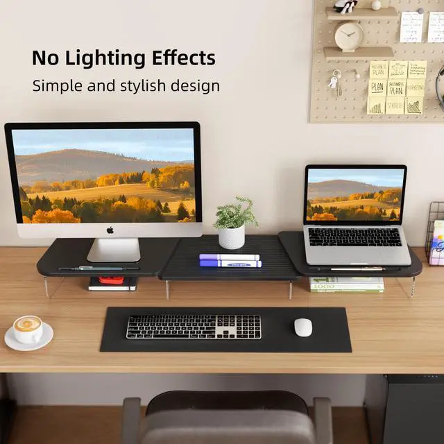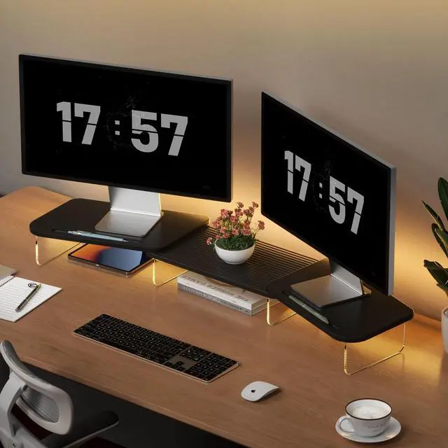 Adjustable Dual Monitor Stand with LED LightElevate your workspace with this adjustable dual monitor stand, a perfect combination of functionality, style, and ergonomic design. Whether you're working, gaming, or organizing, this stand provides the ideal solution to keep your desk neat, stylish, and efficient.