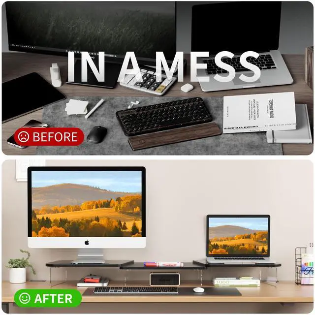 Space-Saving Design: Fits two monitors with ease and creates additional storage space beneath for keyboards, notebooks, cables, and other office essentials.
