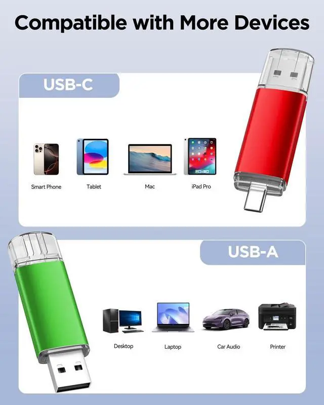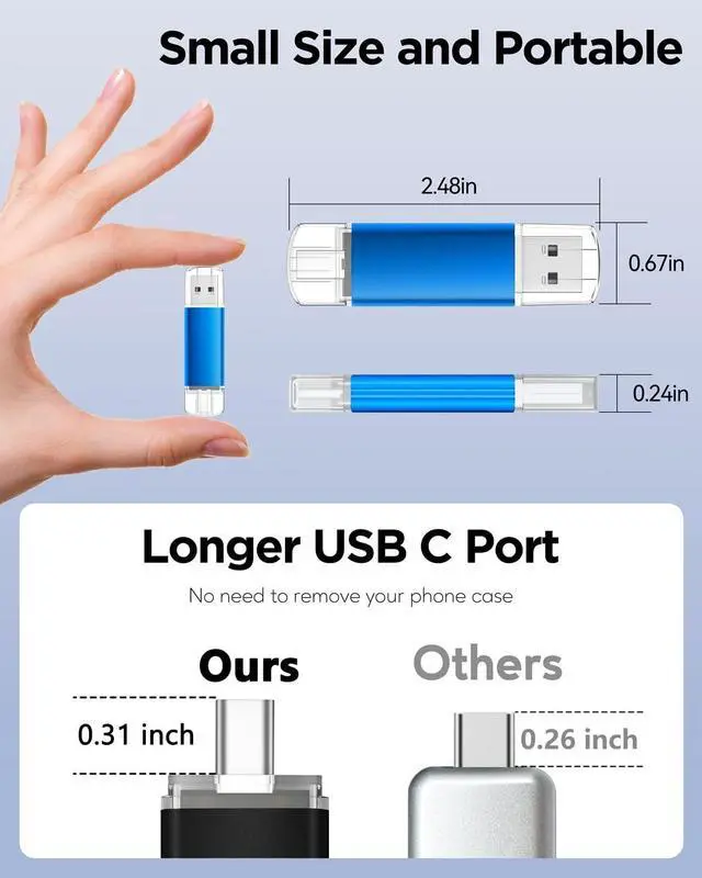DUAL FLASH DRIVE - 2-in-1 USB flash drive is designed with a USB-C plug and a USB-A plug at each end, Dual USB flash drive allows you transfer data between smartphone/tablet and computer more conveniently ^^ PLUG AND PLAY - AreTop USB drive with USB A & Type C simply plug in thumb drive then start transferring and storing data between devices. There is no need to install any software, so you can easily transfer files, pictures, music and videos at high speed. If plug, it works. Easy and convenient! Free up space on your USB Type-C smartphone ^^ WIDE COMPATIBILITY - This 8GB usb stick can be used with laptops, computers, tablets, Android USB-C phones, iPhone15 Series, iPhone16 Series, car audio, printers, smart TVs, embroidery machines, Xbox, PS4.