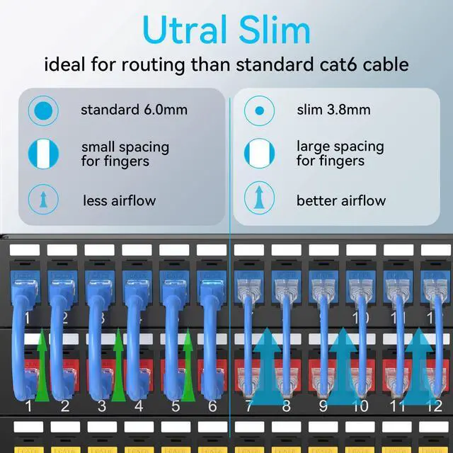 Utral Slim: Cat6A ethernet patch cable stands out for its slim design. Cat6 patch cables is ideal for routing in tight spaces, easy to trace specific cables and much better airflow, compaired with regular patch cables cat6.