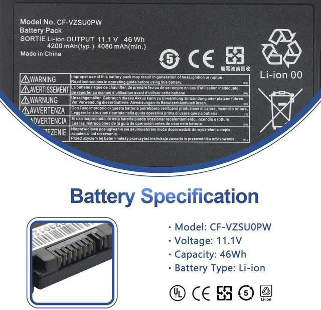 Condition: Brand new, from high quality materials, top circuit boards and smart chip. ^^ Replace Part NumberFit for CF-VZSU0GJS CF-VZSUOPW CF-VZSU0PJS CF-VZSUOLW CF-VZSU0PW CF-VZSU0PR CF-VZSUOGW CF-VZSU0LW CF-VZSU0KJS CF-VZSU0KW CF-VZSU0KR CF-VZSU0PK CF-VZSU0GW. ^^ Compatible Laptop ModelsCompatible with Panasonic Toughbook CF54 CF-54 Mk1 Mk2 Mk3 Series. Panasonic Toughbook 54 Gloved Multi Touch, 54 Lite, 54 Performance, 54 Prime Series, CF-54F9001KM CF-54G2999VM CF-54F0961NE CF-54F0961VM CF-54A0005CM CF-54D2912VM CF-54D0005KM Laptop Notebook Battery. ^^ ANTIEE PromiseEach products has undergone rigorous testing to ensure the correct voltage, circuit protection, stable current, low self-discharge and CE / FCC / RoHS Certified for safety. About 500 recharge cycles over the life. ^^ ANTIEE After-sales12 months of warranty!