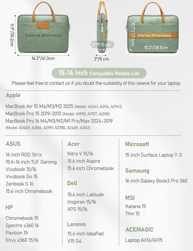 Compatibility: The inner dimensions of this sleeve are 38.5 x 27.1 cm/ 15.2 x 10.7 inches, suitable for most 16.2 -15 inch laptops such as MacBook Pro 16 M4/M3/M2/M1 Pro/Max; MacBook Air 15 M4/M3/M2; ACEMAGIC Laptop AX16/15; Acer Nitro V 16/15; 15.6 inch Acer Aspire; ASUS ROG Strix; ASUS TUF Gaming; ASUS Vivobook 15/16; Dell Inspiron 15/16; HP Pavilion 15; 15.6 inch Lenovo IdeaPad; 15 inch Microsoft Surface Laptop 7-3. Please check the dimensions of your device before purchasing