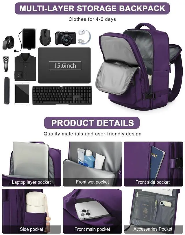 ^^ Separate Shoe Compartment and Wet Pocket There is a shoe compartment at the bottom of the backpack to separate your shoes from other items and keep them clean. The front wet pocket of the Flight Certified Travel Backpack is made of high-density material, which helps you separate dry items from wet items such as wet clothes or towels. ^^ Laptop CompartmentThe laptop compartment of the travel bag is a separate layer for easy access, fits most 15-inch laptops and fits snugly on the back. ^^ Adjustable Breathable Shoulder StrapsThe breathable shoulder straps and back of the laptop backpack are sturdy and durable, stable and comfortable to walk on, and help reduce back sweat.