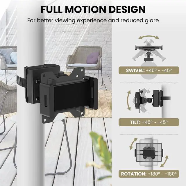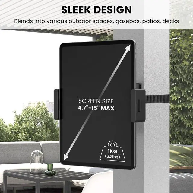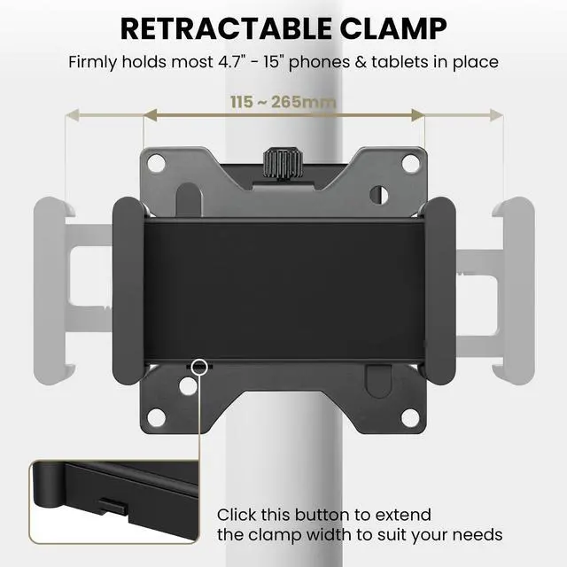 UNIVERSAL iPAD WALL MOUNT & VESA TABLET MOUNT Designed as a flexible iPad wall mount and tablet mount wall solution, this universal clamp is compatible with VESA 75x75 monitor arms. Works with iPads, Android tablets, and smartphones from 4.715 inches, making it ideal for POS systems, offices, retail counters, kitchens, and height-adjustable monitor setups requiring a reliable mounting bracket for tablet. ^^ ADJUSTABLE CLAMP HOLDER ^^ NO-SCREW DEVICE INSTALL The adjustable clamp panel expands to securely grip different tablet sizes without drilling into the device. Functions as an iPad wall mount no screw solution, allowing fast device mounting and removal.