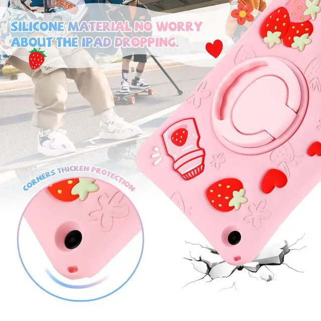 for Galaxy Tab A9 Plus 11 Inch 2023 Kids Case- with Shoulder Strap & Rotating Stand Strawberry Cute Cartoon 3D Kawaii for Girls Girly Teens Soft Silicone for Samsung A9+ 11'' 5g Tablet Case