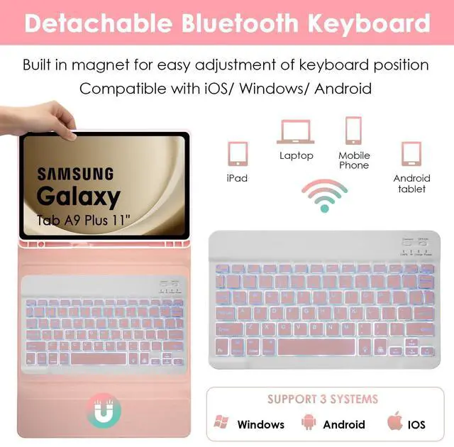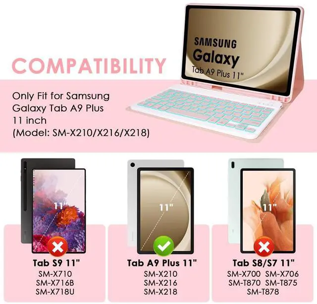 [Compatibility with Samsung Tablet A9 Plus/A11 Plus 11" ]: This keyboard case is exclusively designed for Samsung Galaxy Tab A9 Plus 11 Inch 2023 Model (SM-X210/X215/X216/X218) and Tab A11 Plus 11 Inch 2025 Model (SM-X310/X315/X236). ***Please Click your tablet "Settings-System-About Tablet Model--SM-XXXX") confirm model number before ordering. Not fit for other size or model number! ^^ Maganetically Removable Wireless KeyboardLAMA smart slim case with keyboard designed for Samsung S6 Lite Tablet, using a flip magnet separate design; Detachable Bluetooth keyboard with the magnetic hybrid case that transforms your tablet into a highly performant and easy-to-use laptop. ^^ Full Protective Case with S Pen Holder The premium composition leather exterior and soft, non-slip interior protect your tablet from accidental drops and scratches. The built-in Pencil holder allows you to take your Pencil wherever you want.