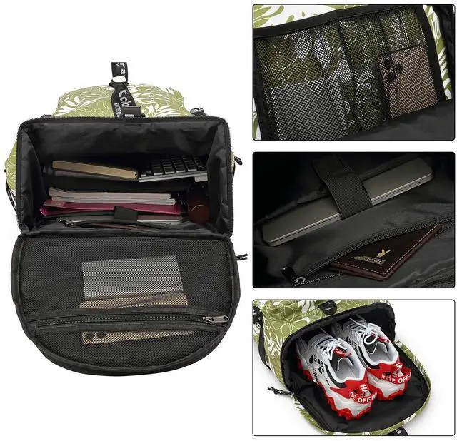 • Large Capacity Roomy Space with practical pockets provides you enough items storage and helps you organize them easily, including 1 front pocket/1 main large compartment/2 side pockets (for bottle and umbrella)/1 shoe compartment. The main compartment contains 1 upper mesh zip pocket, 1 notebook compartment, 2 zip pockets, and 2 slots, can hold your iPhone, iPad, pen, keys, wallet, magazine, clothes, and also be placed in cameras, power bank, etc.