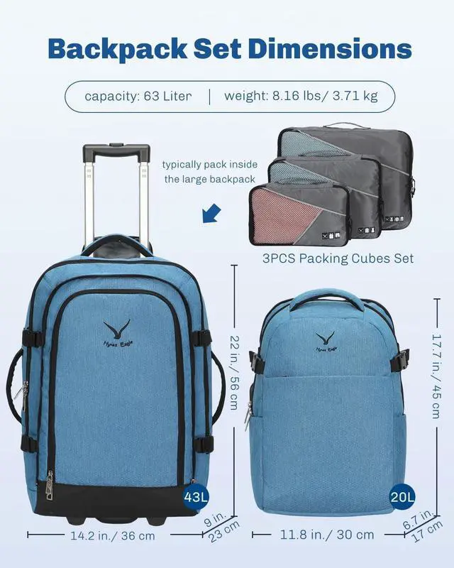 Detachable Daypack: 17.7 x 11.8 x 6.7 in. (45 x 30 x 17 cm), easily fits under the seat, also can slide over rolling luggage handle when on the go, adjustable sternum strap brings extra carry comfort; fits up to 15.6 in. laptop and 10.5 in. tablet, interior mesh zip pocket is easy to organize last minutes accessories, from passport to wallet. travel backpack features a USB-A charging port and a headphone jack (not including power bank), convenient to charge your phone and enjoy music anytime. ^^ 43L Convertible Carry on Rolling Backpack, measuring with 22 x 9 x 14.2 in. (56 x 36 x 23 cm), features spacious main compartment with zip mesh pocket for travel supplies, makes it easy to hide away the shoulder straps when use as luggage, if you want to carry rolling backpack on your back, the back compartment provides a protective padded for comfort, the wheels will not hurt your back, it is also built with adjustable sternum strap.