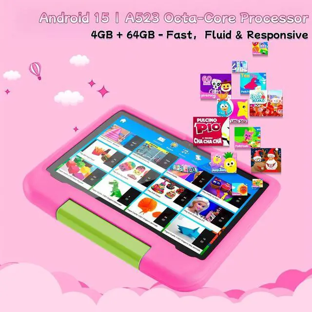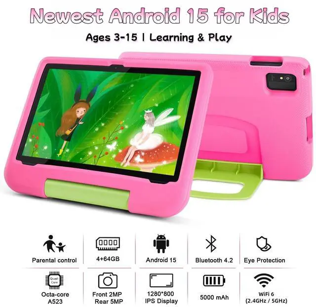 [Powerful Android 15 Tablet for Kids Smooth & Secure Experience] This kids tablet runs the latest Android 15 operating system and is powered by the Allwinner A523 octa-core processor (Cortex-A55, up to 2.0GH z), offering a stable and smooth performance. Preloaded with certified GMS and Widevine L1, it supports seamless multitasking and secure content access ^^ [ 10.1" HD IPS Display Ideal for Learning and Entertainment] Featuring a 10.1 -inch IPS screen with a 1280 800 resolution and 16:10 aspect ratio, this Android tablet for kids provides vivid visuals and responsive touch control. The LCD screen includes eye protection mode to reduce blue light and safeguard children's vision during extended use ^^ [8GB RAM (4GB+4GB Extended) + 64GB ROM, Supports 1TB MicroSD] This tablet for kids offers 8GB RAM (4GB physical + 4GB virtual) and 64GB storage, allowing smooth app usage and media storage.