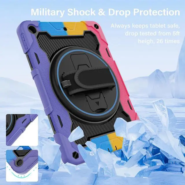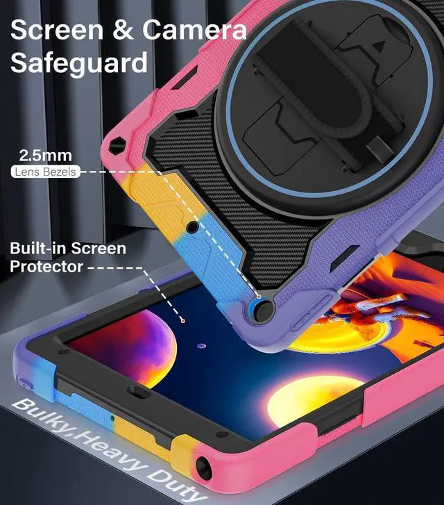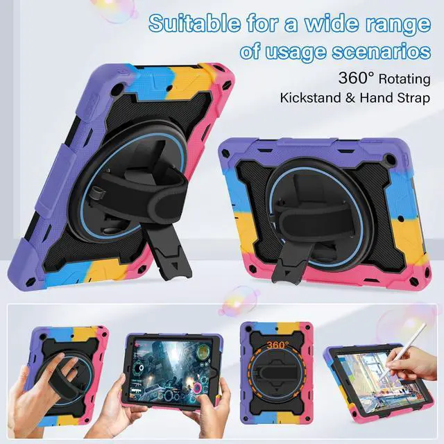 Not only increase ten times shockproof impact resistance, but also increase extra dissipate heat by upgrade built in soft endothermic sponge ^^ [360 Rotating Kickstand / Hand Strap] Multiple angles kickstand and hand strap suit for all kinds of group, such as toddler / children / kids, make money people at office/restaurant / school / warehouse / outside, students at elementary school /middle school/ high school /university, senior people at home, and another people ^^ [Built-in Screen Protector+Detachable Shoulder Strap] Raised edges on the screen protection + have built in screen protector protection, truly made work to protect screen of iPad 9th/8th/7th gen from scratching and breaking.