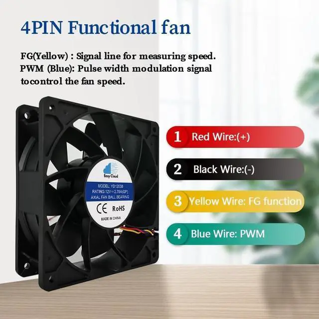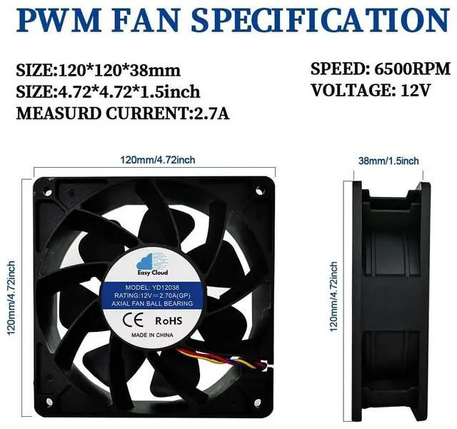 • RATED VOLTAGE&CURRENTRated Voltage: DC 12V; Rated Current: 2.7Amp; Noise Level: 66 dB