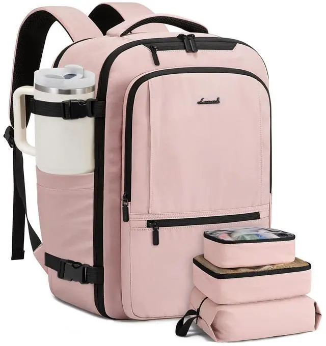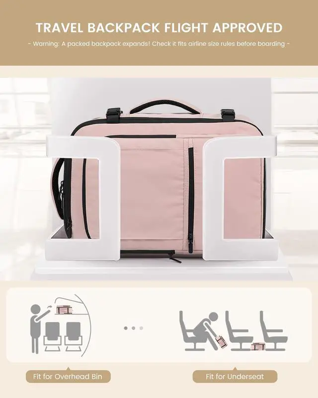This carry on backpack fits under seats or in overhead binsno checked baggage fees ^^ 3 Packing Cubes & 13 PocketsWeekender bag with 3 cubes (toiletry/mesh/shoe) and 13 pockets including a wet pocket - Keeps travel essentials like clothes, shoes, and toiletries organized and accessible ^^ Urban Travel & Commuter ReadyFeatures handles on the top and one side, a luggage strap, and side water bottle pocket. This sleek, minimalist backpack transitions easily from business commutes to city exploration ^^ Comfort & DurabilityTravel bag is made with water-resistant materials and padded shoulder straps for all-day comfort.