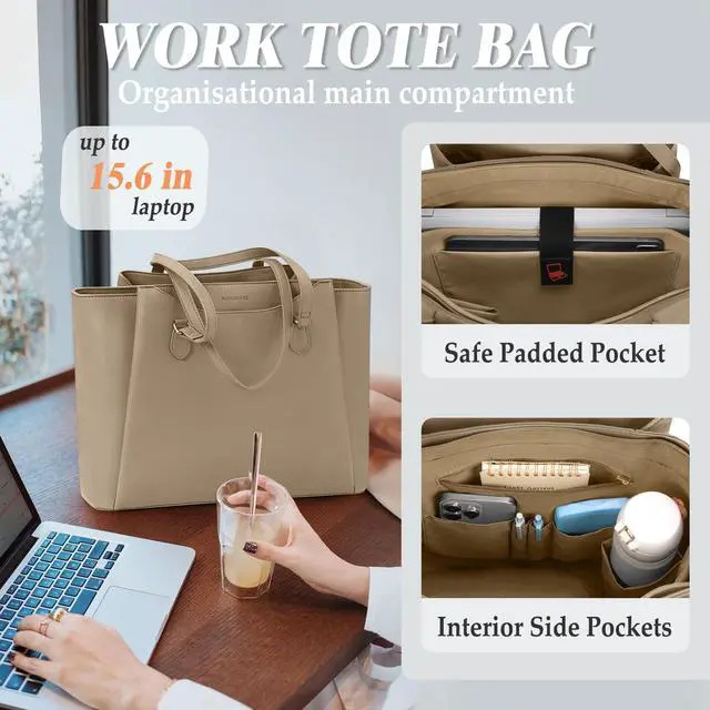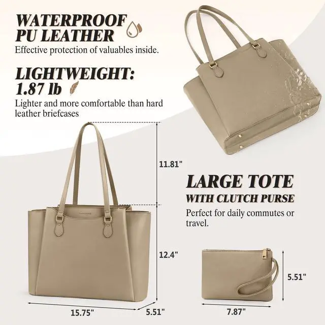 PROFESSIONAL LAPTOP BAG FOR WORK: This work tote bag has a dedicated padded pocket in the main compartment fit for laptops up to 15.6" and tablet PC, protects electronic devices from accidental drops or impacts. There are also 2 open pockets, 2 pen insert pockets, 1 zip pocket and 1 water bottle pocket to keep items organised. And 3 large capacity magnetic compartments on the outside of the tote bag for safely storing valuables and other frequently used items that need to be accessed quickly. ^^ ELEGANT WORK BAG FOR WOMEN This computer tote bag is made of PU leather, which is waterproof, scratch-resistant and durable. The inner lining of the laptop purse is made of high quality polyester which is soft and tear-resistant, and no matter how vigorously you rummage inside the bag in office setting or conference, it won't make an annoying "crunchy" sound. There are 4 metal feet and flat insert at the bottom, so the handbag can stand up by itself and remain elegant at all times. ^^ LARGE CAPACITY & COMFORTABLE TO CARRY: This large tote bag for work measures 15.75" * 12.4" * 5.51", providing spacious storage space for laptop, files, books and other daily necessities. The womens laptop purse's 11.81" handle drop length ensures easy carrying by hand or over the shoulder. This soft leather work briefcase weighs only 1.87 lb, which is lighter than the hard laptop tote for women, making it the perfect choice for daily commuting and professionals on the go. ^^