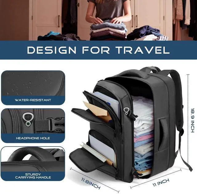 Expandable Large Capacity: This travel backpack features an expandable function. You can open the zipper to expand the capacity and get more storage space. It is easy to increase the thickness of the carry on backpack by 3.35 inches, making the capacity of the travel laptop backpack reach 50L, which can accommodate a 17.3 -inch laptop and easily carry travel supplies for 3 to 5 days. ^^ Comfortable and Soft This travel backpack is equipped with a soft and comfortable backrest, adjustable and breathable shoulder straps, and an air mesh ventilation rear panel. It better protects your travel items while providing maximum support for your back. It can effectively relieve the pressure on your shoulders and neck, making you more comfortable when carrying the travel backpack for a long time. At the same time, this backpack also adopts water-splash-resistant fabric. ^^ Multi-compartment Design The normal size of this travel backpack is 19* 12.5 * 7.8 inches;