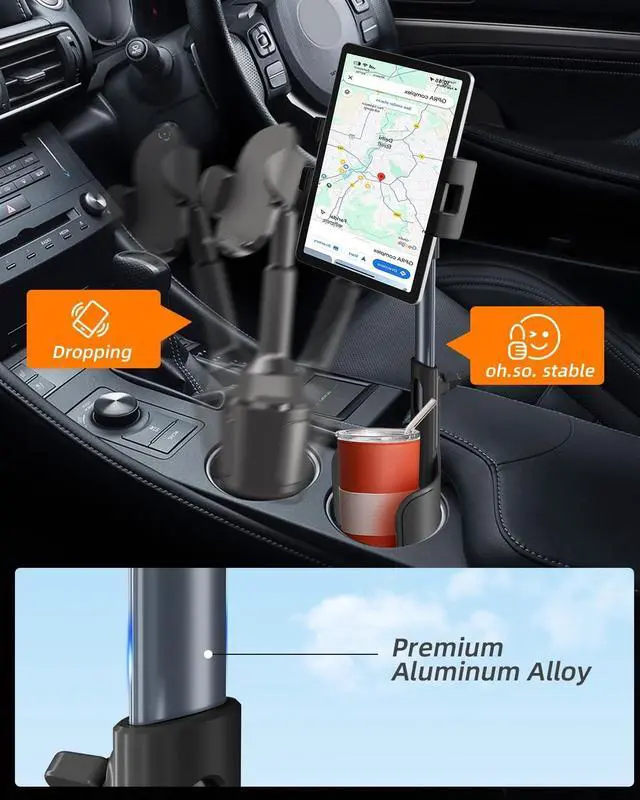 ALUMINUM ALLOY POLE: The ipad cup holder mount for car bottle is constructed with a sturdy aluminum alloy straight pole that stays firmly in place, even on steep surfaces or muddy country roads.