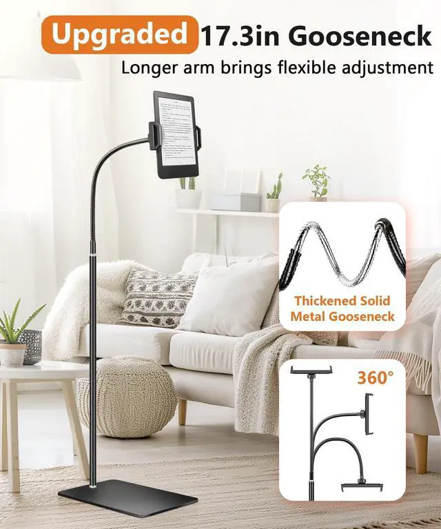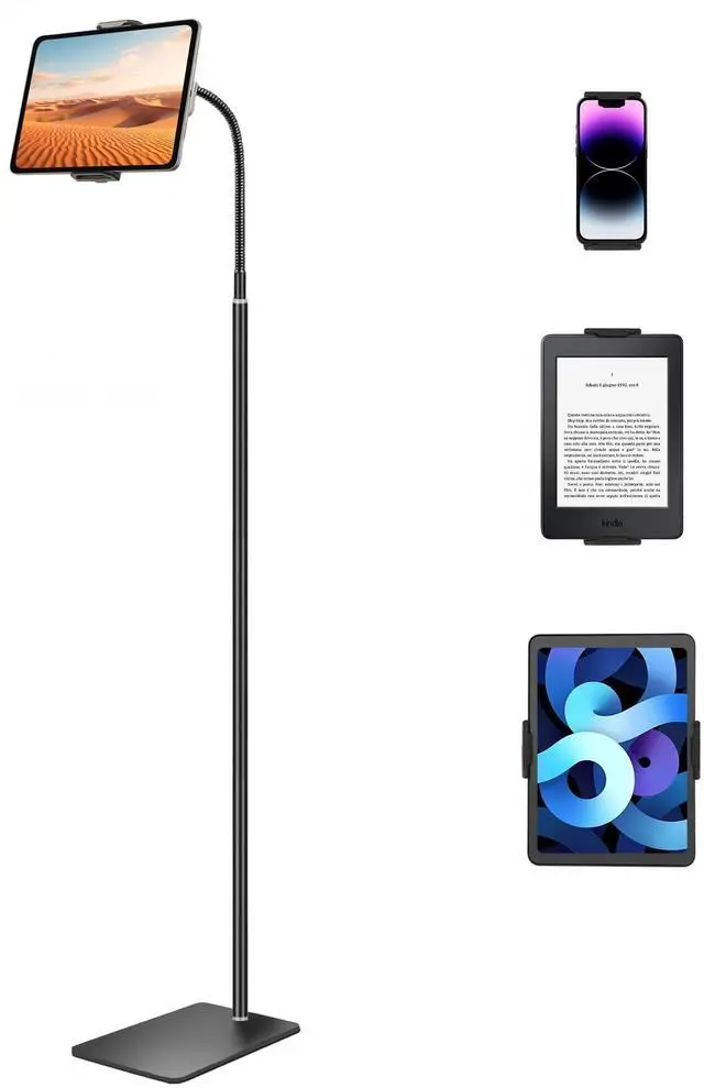Whether you are lying, standing or sitting, this stand ensures the perfect viewing angle for any posture, increasing comfort and comfort ^^ Multi-Angle Rotatable iPad StandThe 16.9 inch flexible gooseneck arm allows effortless bending and adjustment in any direction. Paired with a universal ball joint with a 360 rotating head, this tablet stand allows seamless multi-angle positioning to ensure your iPad is always perfectly aligned to your preferences ^^ Wide Compatibility Our floor stand offers extensive compatibility and supports a variety of devices with screen sizes from 11.9 to 12.9 inches. It seamlessly accommodates iPad Mini, Air, Pro, Galaxy Tab, Kindle, Smartphones, E-readers, Surface Pro and Switch, making it a versatile and essential accessory for your needs