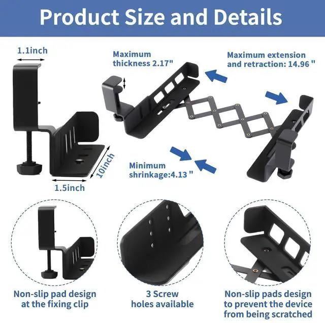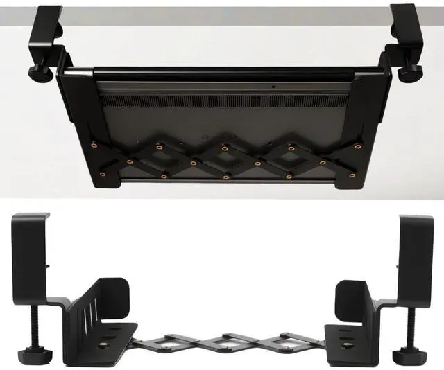 Revamp Your Workspace: Under Desk Laptop Mount unlock the hidden potential of your desk by banishing clutter! Our upgraded version laptop under desk mount is the ultimate space-saving solution. It attaches securely, providing a snug haven for your laptop beneath the desk, instantly liberating your work surface for enhanced productivity ^^ No Drill & Easy To Install: 1. Fix the telescopic frame and the clamping bracket with screws. 2. Fix the stand to the table and adjust it to fit the size of the equipment that needs to be stored. 3. Place the device you want to store ^^