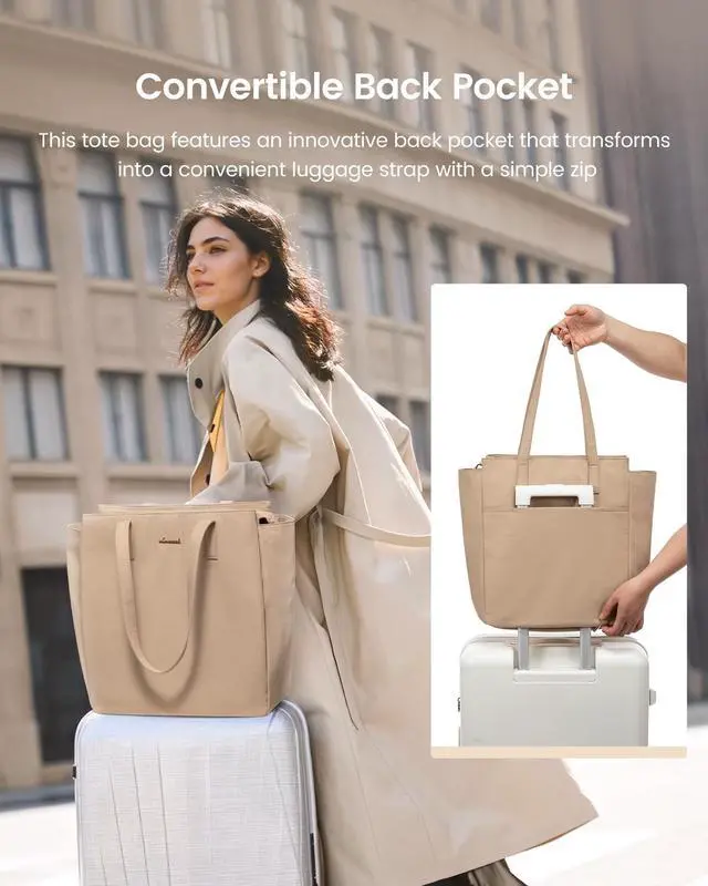 Convertible Back Pocket: Unzip the back pockets bottom to transform it into a convenient luggage strap, allowing you to secure the work tote bag on a suitcase handle during travel, or zip it up to use as a secure pocket.