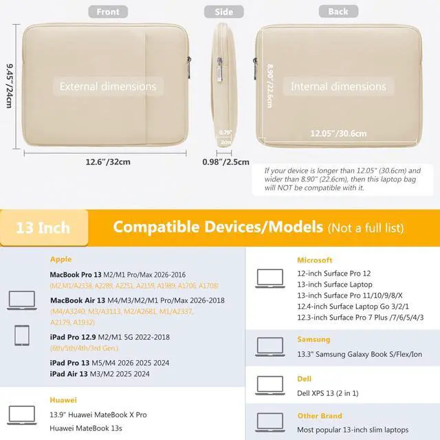 Internal Dimensions: 12.05" x 8.9" x 0.79". Compatible with MacBook Air 13 M4/M3/M2/M1 2025-2018 (A3240, A3113, A2681, A2337, A2179, A1932), MacBook Pro 13 M2/M1 Pro/Max 2025-2016 (A2338, A2289, A2251, A2159, A1989, A1706, A1708), Dell XPS 13, 13"- 12.3" Surface Pro, 12.4" Surface Laptop Go, iPad Pro 13 M4, iPad Air 13 M3/M2, iPad Pro 12.9 2022-2018, Huawei MateBook 13s, 13.9" Huawei MateBook X Pro, 13.3" Samsung Galaxy Book S/Flex/Ion, and most 12"-13" slim laptops/tablets, etc. ^^ 360
