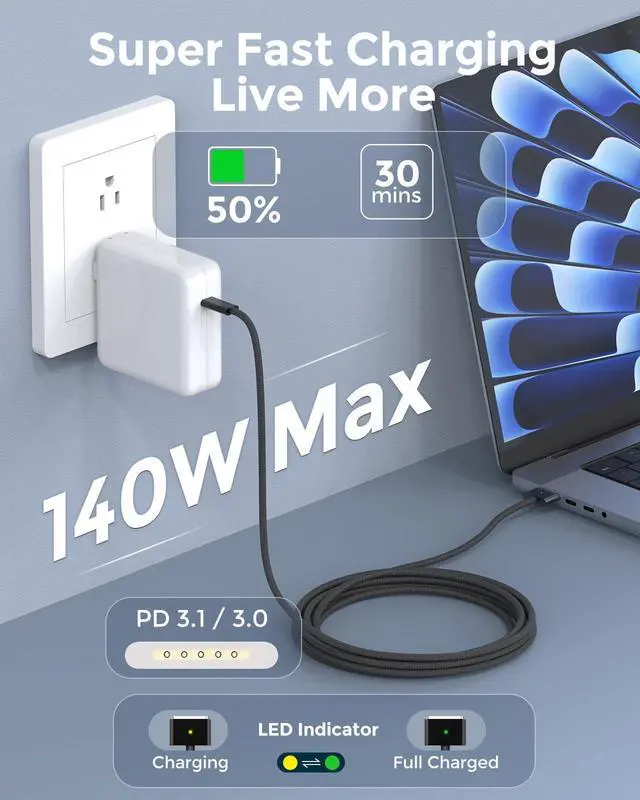 ^^ Super Fast Charging: fast charge your MacBook Pro or MacBook Air up to 50% in only 30mins which is Official Standard Charging Speed, PD 3.1 / 3.0 work perfectly with 140W 96W 70W 35W 30W and any USB-C power adapter to meet the high-speed processing capacity of M4, M3, M2, M1 Pro Max chip. ^^ High Compatibility with