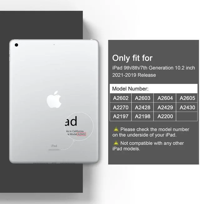 • CompatibilityPlease Note: Designed for iPad 9th/8th/7th Generation 10.2" 2021 2020 2019 (Model number: A2602 / A2603 / A2604 / A2605 / A2270 / A2428 / A2429 / A2430 / A2197/A2200/A2198) Not compatible with any other iPad models.