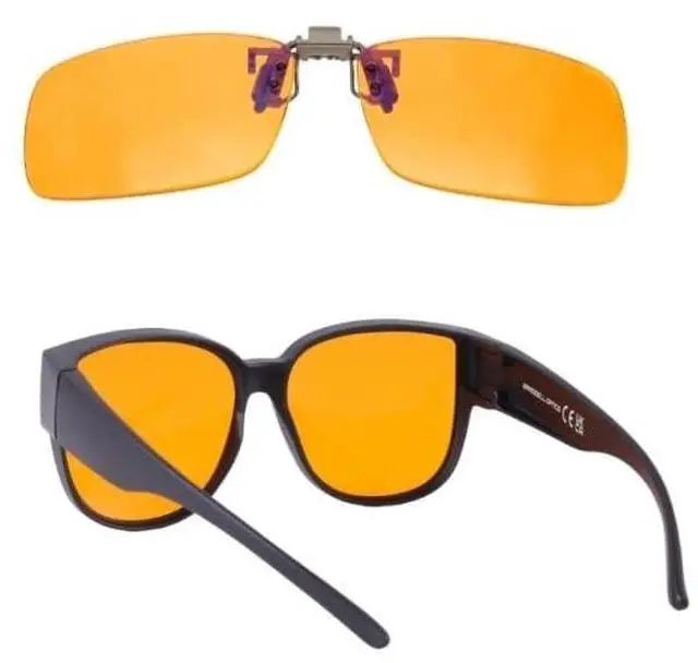 Protect against Harsh & Bright Vehicle Head-Lights while Driving for Light Sensitive Eyes and Photosensitive Wearers with Photophobia ^^ Clips over Prescription and Reading Glasses (Eyewear frame in photo for demonstration purposes only) ^^ Precision Tinted to Block UV Rays and 99% of Blue Light, Effective again Bright Fluorescent and LED Lights