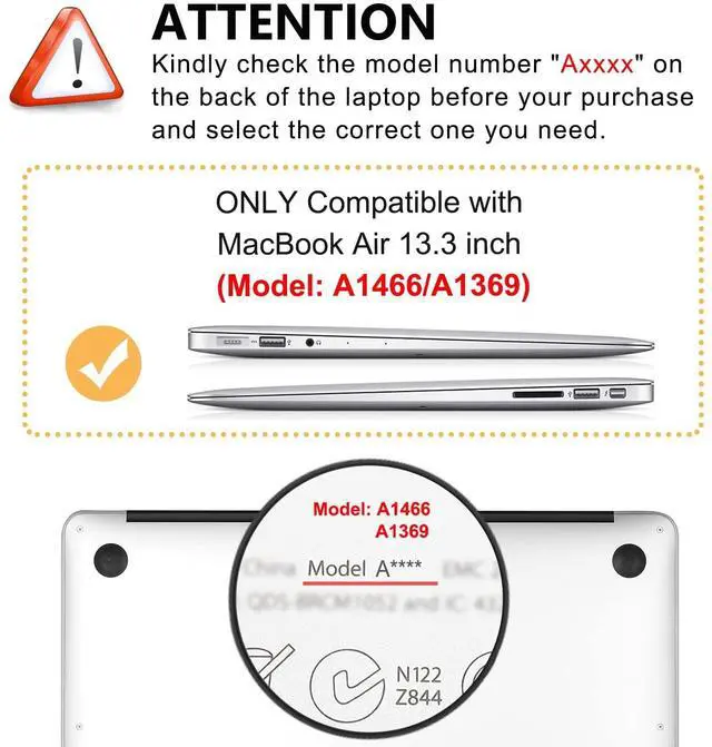 ^^ WARNING: The case was designed ONLY to be compatible with MacBook Air 13 inch (A1369/A1466, 2010-2017 Release ). ^^ NO CUT OUT design but you can see the logo through the case. Made out of a rubberized, hard plastic. Easily Snaps On and Off. Fits perfectly on your mac in just under a minute. ^^ Clamps all around the body of the computer and provides you with great all round protection. Prevents appearances of scrapes, scratches, dints, spills and dirt but still allows you easy access to all ports and buttons. ^^ Grille slots in the bottom for heat dissipation: Bottom cutouts are cut correctly around all ports and vents cut to allow breathing.