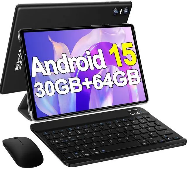 2025 Android 15 Tablet with Keyboard, 10.1 Inch Tablets FHD Display 30GB RAM 64GB ROM 1TB Expand, Octa-Core 2.0GHz, Widevine L1, 6000mAh Battery, 5G WiFi & GPS, Gemini AI, 2-in-1 Tableta PC - Black