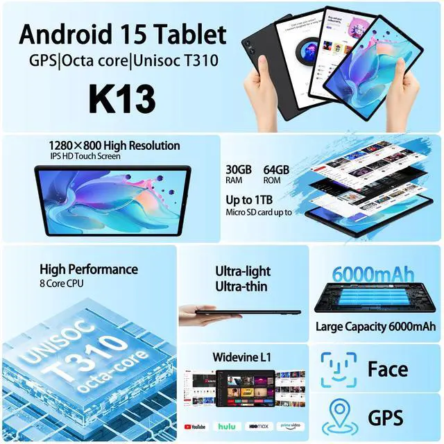 Featuresa. Paired with the latest Android 15 systemb. Uses powerful performence octa-core processorc. 30(8+22)GB RAM + 64GB ROM, Expandable to 1TBd. Support GPSe. Support Widevine L1f..