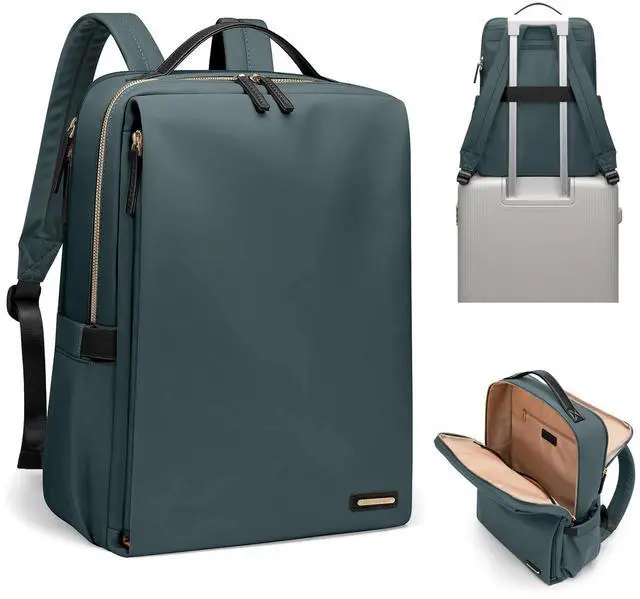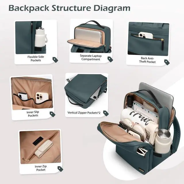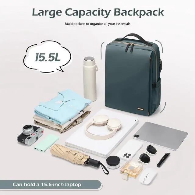 Stylish & Functional- Elevate your everyday style with our laptop backpack for women. Available in multiple color options, the backpack features a sleek design and a roomy interior to fit your daily essentials. Measuring 16.1" x 5.1" x 11.4" /41 x 13 x 29cm, it's perfect for work, travel, college, and so on. ^^ Roomy & Organized- The backpack's large capacity features a separate laptop compartment that can fit up to a 15.6" laptop, a spacious main compartment with 2 slip pockets and a zipper pocket. Outer with 2 vertical zipper pocket, 1 back anti-theft pocket, as well as a 2 side pockets and a luggage strap for added convenience.