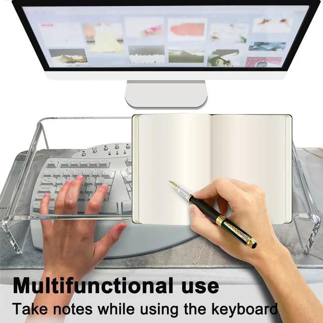The cat will lie on it and accompany you to work, making your work more focused and more interesting. ^^ It's made of durable thick clear Acrylic. Can easily see the monitor screen behind it since the Acrylic is so clear. The sides look like clear ice - they are surprisingly pretty! ^^ Smooth rounded edges, Its safer than glass. Perfectly polished, no rough or sharp edges to hurt yourself. ^^ This shelf is the perfect size. Height 4.8 inches, gives enough space for your hands to type comfortably.
