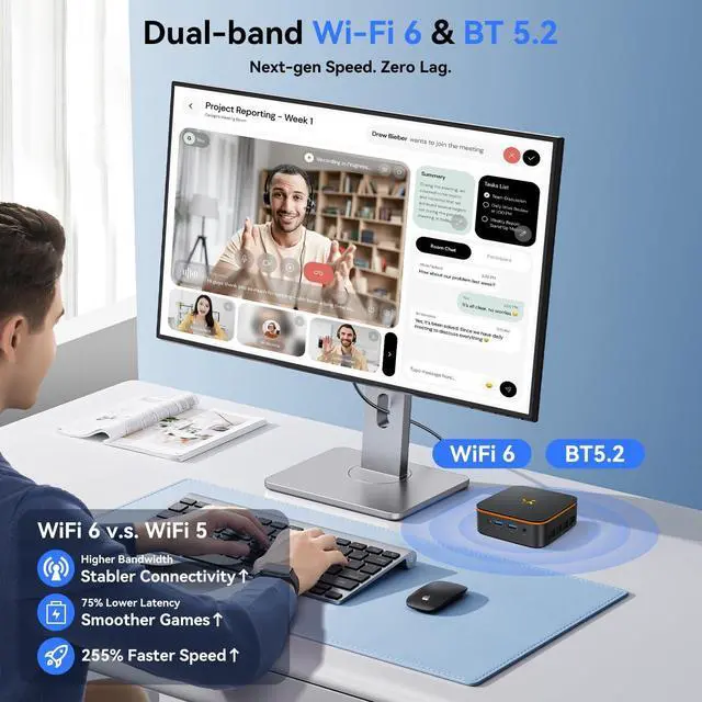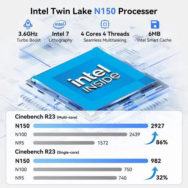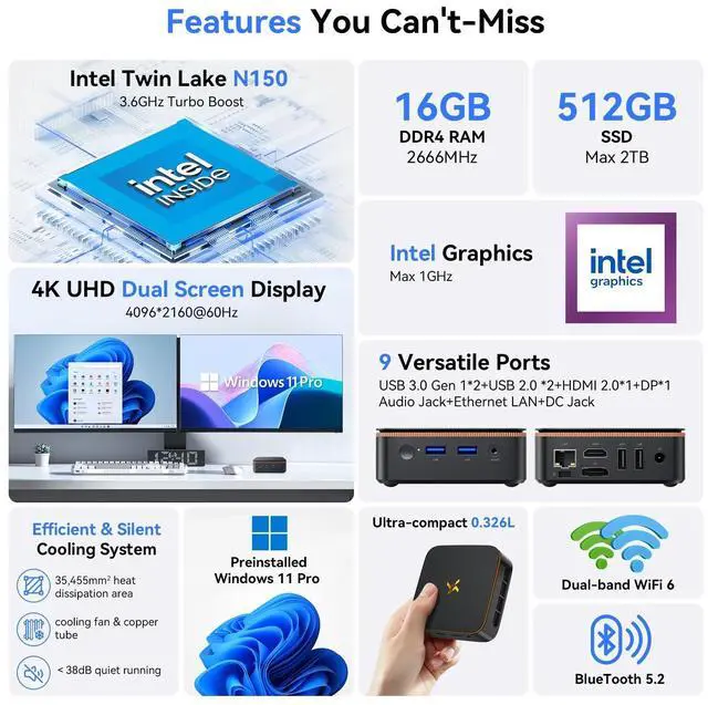 2025 New N150 Mini PCHuidun H50 Mini PC is powered by 2025 New 12th Gen processor N150, with a maximum main frequency of 3.6GH z. As an upgraded version of the N100, its overall performance has been increased by 6-10% for smoother operation. Compared to traditional desktop computers, this mini PC is not only compact but also has a minimum power consumption of only 6W, which is equivalent to the power consumption of a 50W fan running for 20 minutes in a week of continuous use. ^^ 16GB DDR4&512GB SSDThe 16 GB DDR4 RAM mini PC allows you to have all your essential applications open at once, saving time and improving your workflow.