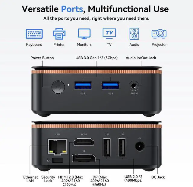 The 512 GB internal M. 2 SSD provides enough space to store all your important documents and applications. Storage space can be expanded up to 2TB (not included) using the M. 2 NGFF/SATA slot, for easy file storage. ^^ Supports for dual 4K monitors at 60 Hz The mini pc is equipped with 1 HDMI port and 1 DP port, supported 4096x2160 at 60 Hz, you can connect 2 displays with the mini PC at the same time, making your multitasking operations more efficient. Supports RTC Wake and Auto Power On, and also has a fan for better cooling, it is a mini PC for home and office use.