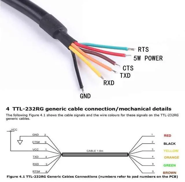 On board FT232RQProvides single chip USB to asynchronous serial data transfer interface, Features genuine FT232RQ chip technology, ensuring stable drivers and seamless plug-and-play operation on Windows, Mac OS, and Linux systems. ^^ The VCC power output signal (RED wire) is 5.0V. The source of 5.0V is the USB VBUS input, which is switched onto the power output signal. At the time of releasing these cables, this cable was not available. ^^ Integrated Design & Color-Coded WiresInternal EEPROM with user writeable area, 6 way outputs provide TXD, RXD, RTS#, CTS#, VCC and GND.