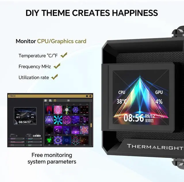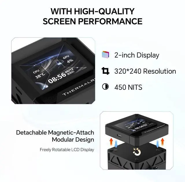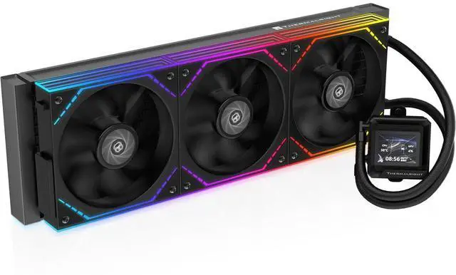 LCD screen: 2in 320 x 320 LCD on the pump head displays real-time PC statistics such as CPU temperature, usage and fan or pump RPM, or custom images and GIFs, and can rotate to stay upright in different case layouts ^^ 360mm AIO