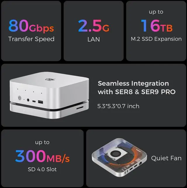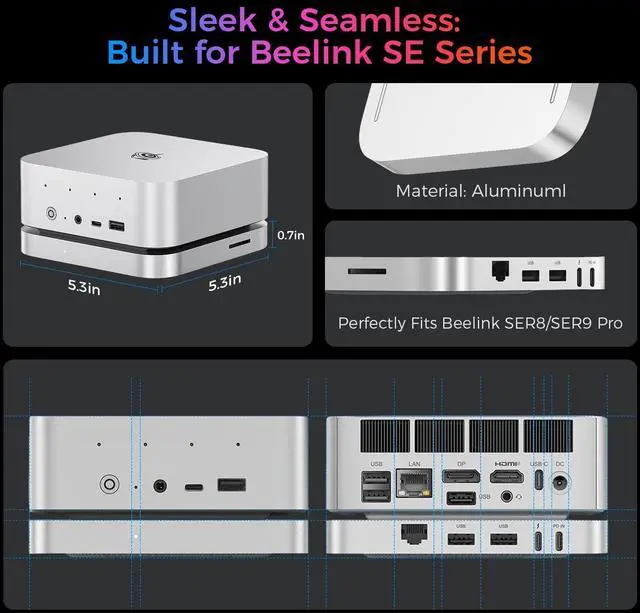 Series Mini PCs: Featuring a sleek aluminum alloy shell, the Mate SE-A seamlessly integrates with Beelink SER8/SER9 PRO. Its ultra-slim profile( 5.315 x 5.315 x 0.709 in) and minimalist design create a space-saving setup ^^