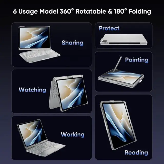 NOTE: Not fit for iPad pro 11 (M4) 2024, Were happy to help if you need to check compatibility. ^^ 7 Usage Modes - iPad Pro 11 Case with Keyboard comes with a dual-axis rotatable 360 hinge, which is rigorously tested for 20, 000+ cycles for long-lasting use. With 360 rotation and 180 flip, it can be freely adjusted to any angle to find the perfect usage mode in any usage scenario. ^^ Precision Trackpad - With self-developed trackpad chip, iPad Air 11 inch 2024 Keyboard Case has a full-area high-precision as well as high-sensitivity trackpad that supports multi-touch gestures. Edit documents, browse the web and create presentations with unrivaled speed, adding more help to your efficient work. ^^ 7 Colors RGB Backlit Keys - The iPad Pro keyboard comes with 7 different color-coordinated RGB backlit, and the backlit projects beautiful colors through laser-etched key characters and letters. The keyboard can be adjusted to 3 different levels of brightness, so you can edit content in dimly lit environments without a hitch. ^^ Thoughtful features - Hard case - The iPad air case protects the front and back of iPad from scratches caused by accidental drops and bumps.