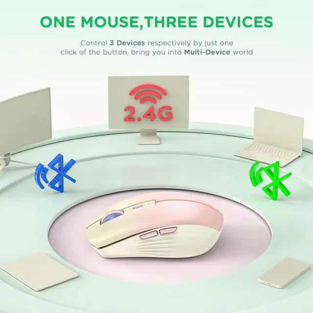 INNOVATIVE GRADIENT COLOUR DESIGN - Innovative unique gradient color that shocks your perspective. coupled with fine craftsmanship, make your mouse shine. Is a perfect gift choice. ^^ EASY TO CONTROL 3 DEVICE - Dual Bluetooth 5.1 modes and wireless 2.4G technology. It realizes accessible switches between 3 devices by clicking the mode switch button located at the bottom of the mouse. The indication lights of BT1, BT2, and 2.4G USB are green, blue, and red, respectively. Simple & convenient to work from the desktop to the tablet, or laptop to MacbookiPad, etc.