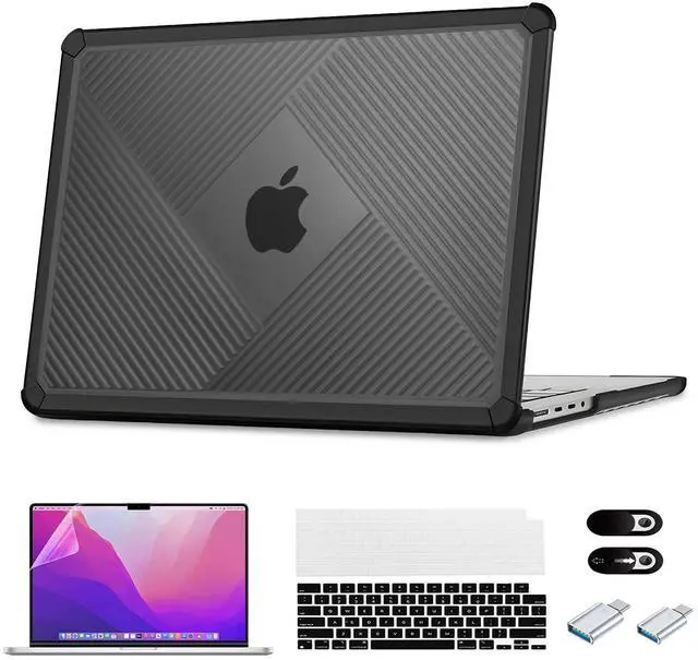 MacBook Pro 14-inch (Model: A3401/A3185/A3112/A2992/A2918/A2779/A2442) released in 2024-2021 with M4 M3 M2 M1 Pro/Max chips. Not suitable for other models. Please confirm the model number on the back of the laptop before purchasing ^^ The product includes 1x protective case, 2x matching keyboard covers, 1x screen protector, 2 x camera covers, 2 x OTG adapters, providing all-round protection for your device ^^ The frame of the protective case adopts a wrap-around shock-absorbing flexible TPU soft rubber to provide buffering protection. The middle is made of PC hard shell material, with a diamond-shaped frosted stripe design, which can protect your laptop while showing your personality ^^ The bottom cover is designed with breathable vents and four non-slip feet to provide stability and promote air circulation to prevent overheating, ensuring that your device stays cool even after long-term use ^^ The protective case port has been precisely cut to ensure a perfect fit for the device, keeping all interfaces and functions functional