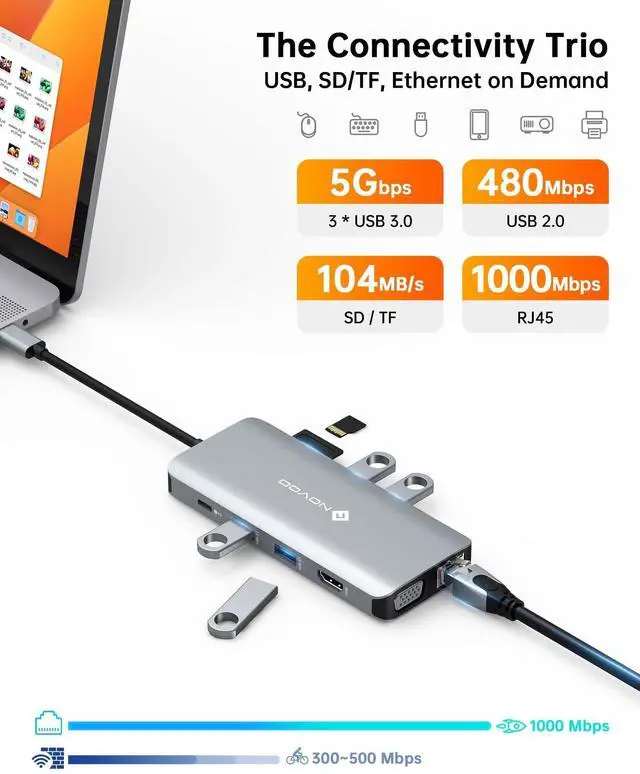 VGA Output: Easily extend or mirror your display with the USB C to HDMI adapter supporting 4K@60Hz resolution, or connect older displays via the VGA port with Full HD 1080p, making this USB C hub HDMI ideal for work presentations, streaming, or multitasking. ^^ Data Transfer & Multiple