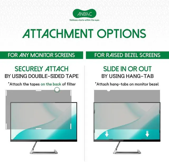 Width: 20 15/16" (532 mm), Height: 11 49/64" (299 mm), Diagonal: 24"W9 ANBAC ATTACHMENT TYPE PRIVACY SCREEN FILTER is compatible with all major brands such as HP, Dell, Samsung, Lenovo, LG, Acer, ASUS, ViewSonic, and the others. Please check your screen's width and height measurement in order to purchase the right filter for your screen size. (We advise that you DO NOT DECIDE your order only based on your screens diagonal size). ^^ PACKAGE CONTENTS - Each package includes one ANBAC privacy screen filter, a quality microfiber cleaning cloth and a set of clear double sided tape & slide mount hang-tabs. Choose between two installation options.