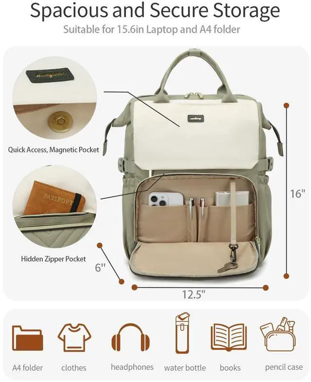VANKANY Laptop Backpack for Women, College Bookbag School Backpack for High School Teen Girls, Work Bags with Cup Holder & USB Charger for Teacher Nurse Travel, Beige Green
