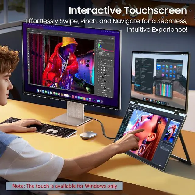 Enhanced Control: Navigate, swipe, and interact directly with your content thanks to the responsive touchscreen. Whether you're editing, sketching, or simply scrolling, the intuitive touch experience brings a new level of convenience and precision to your workflow, making this dual screen monitor a true laptop screen extender. IPS screen, 100% sRGB color gamut and E<2 guarantee accurate color reproduction. *The touch is available for Windows only* ^^ All-in-One Connectivity for